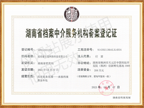 湖南省檔案服務(wù)機(jī)構(gòu)備案登記證書